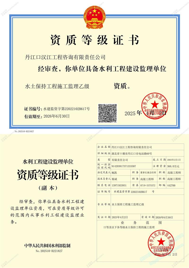 (原漢江綜合開發(fā)公司水利水電監(jiān)理中心)成立于 1989年3月,1993年6月經(jīng)水利部審批成為首批注冊監(jiān)理單位 (隸屬于長江水利委員會), 注冊資本 360萬元 。公司位于湖北省十堰市丹江口市電站路。公司目前擁有水利部頒發(fā)的 水利工程施工監(jiān)理甲級 、 水土保持工程施工監(jiān)理 乙 級 資質(zhì) ;住建部頒發(fā)的 房屋建筑 、 市政公用工程監(jiān)理 乙 級資質(zhì) 。 可獨立承擔(dān) 各類水利水電工程 、 一般工業(yè)與民用建筑工程監(jiān)理 , 土地整治 , 招標代理 、 技術(shù)咨詢 等業(yè)務(wù)。公司實行董事會領(lǐng)導(dǎo)下的總經(jīng)理負責(zé)制,下設(shè)辦公室、經(jīng)營部、財務(wù)部、工程技術(shù)部等職能部門。……